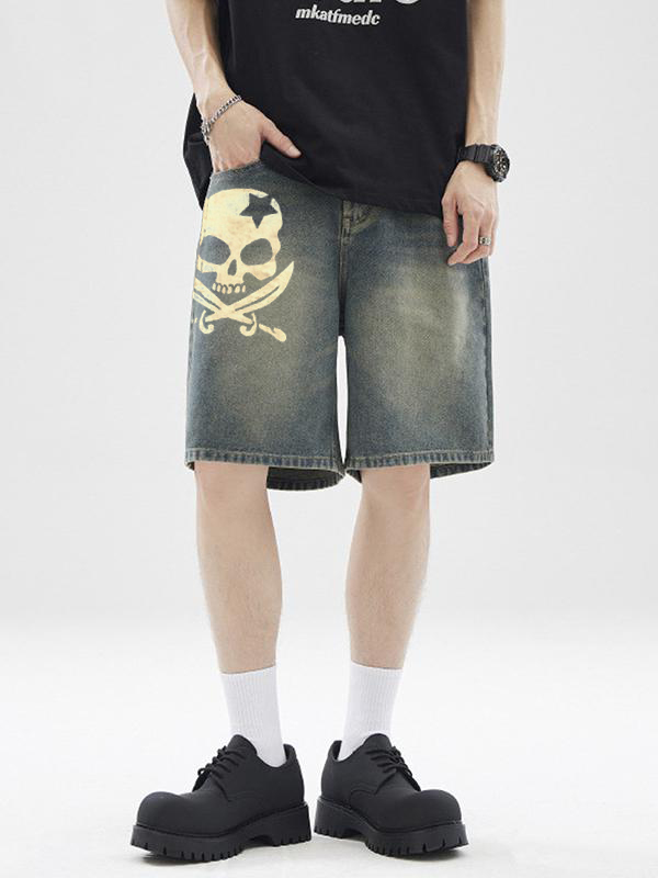 Pantalones cortos de mezclilla sueltos con estampado de calavera para hombre