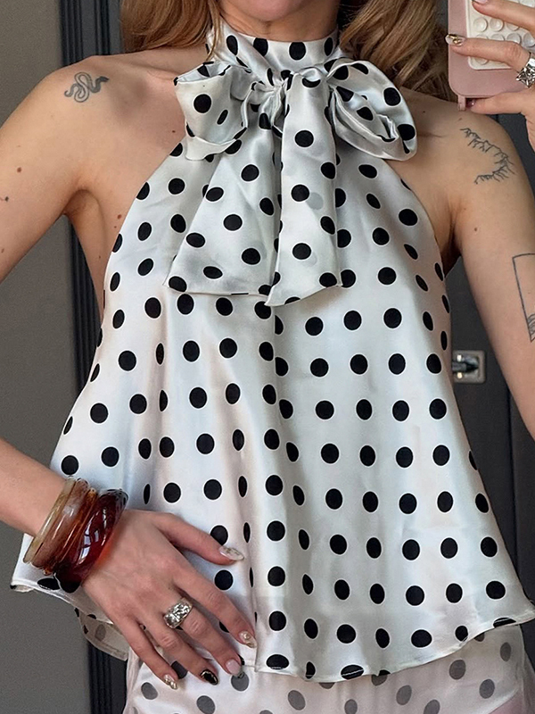Top camisola de satén con estampado de lunares y cuello de lazo