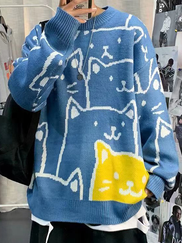 Suéter con cuello redondo en jacquard con gato de dibujos animados para hombre
