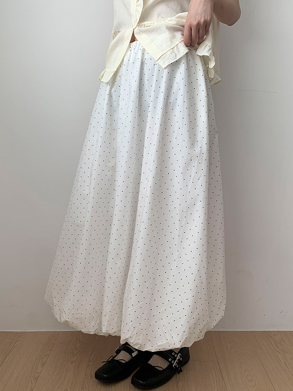Dulce chica con falda larga de lunares blancos