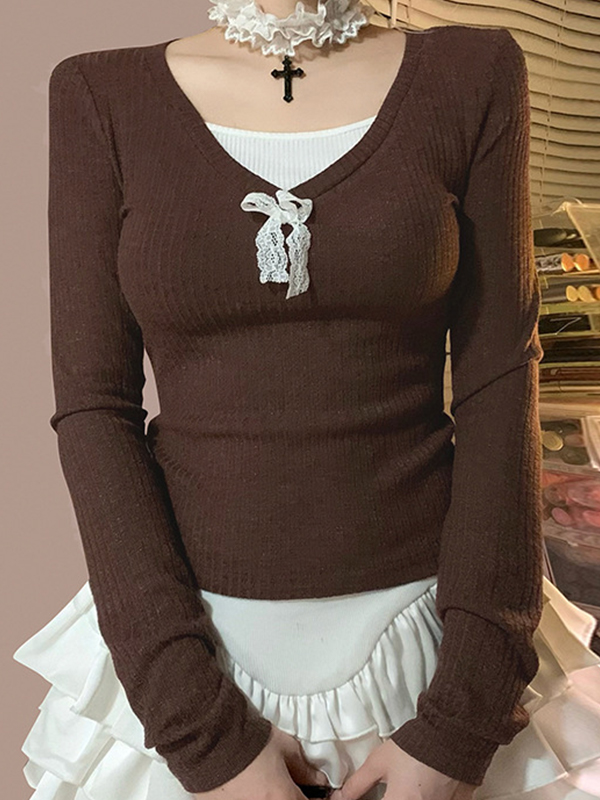 Camiseta de manga larga extragrande con lazo de encaje y color en contraste