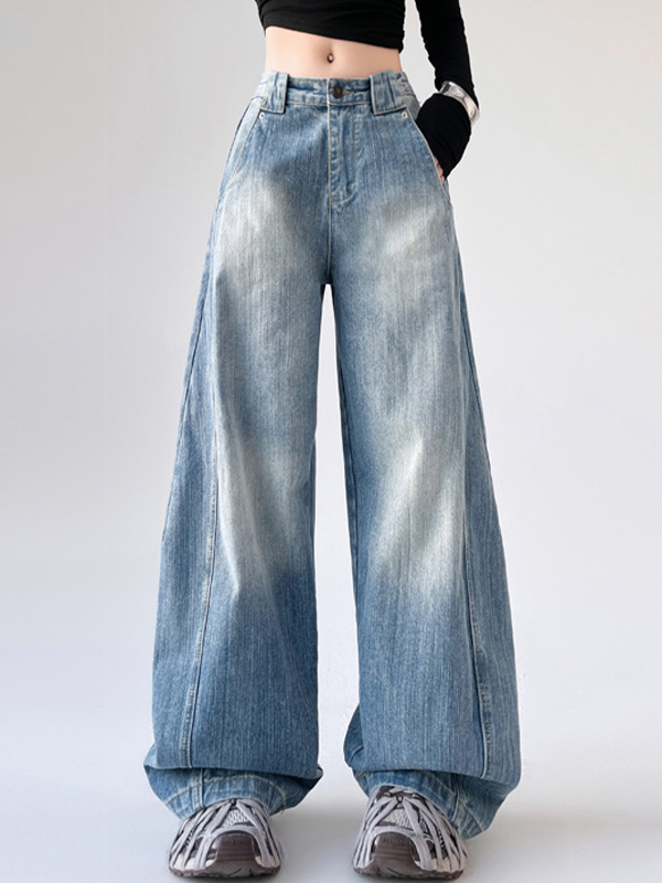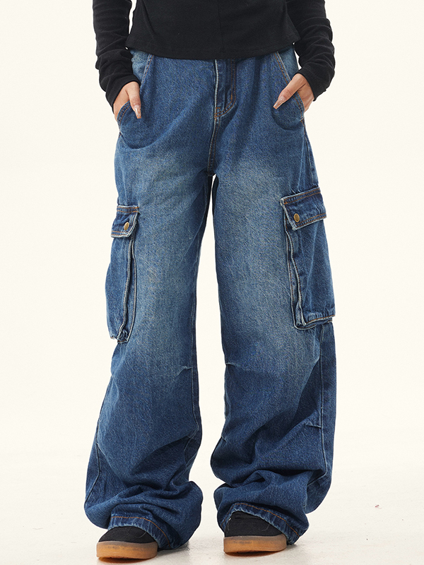 Jeans de trabajo con múltiples bolsillos, lavados y desgastados, estilo retro