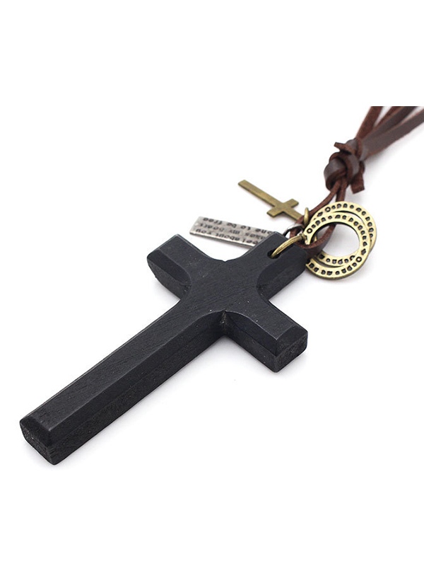 Collar de cuero con colgante de cruz de madera