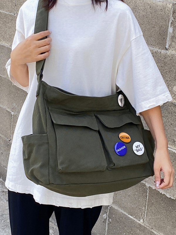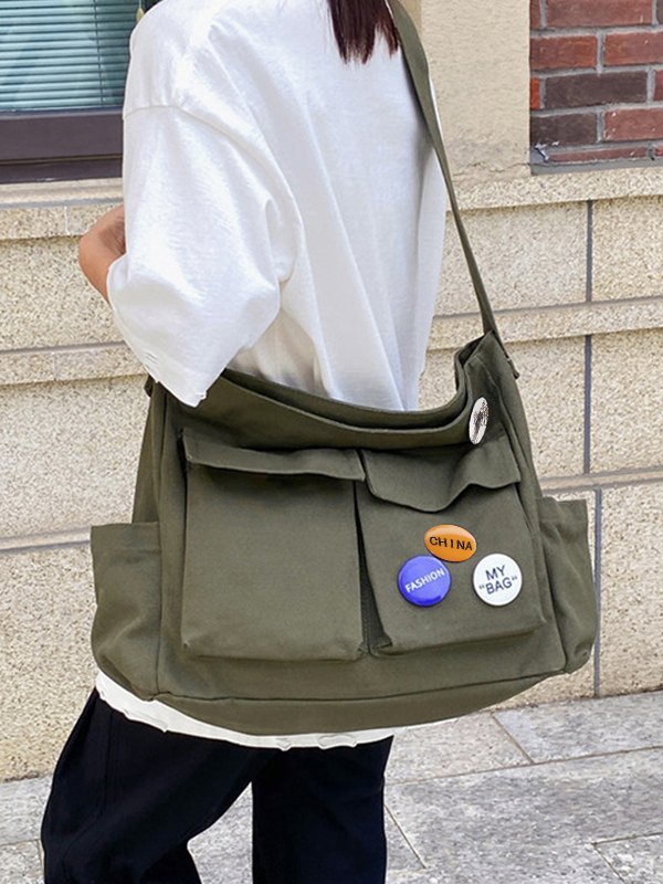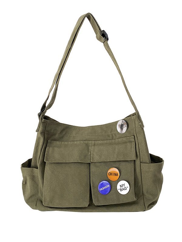 Detalles: cuenta con una correa ajustable para el hombro, con colgantes de insignias múltiples, bolsillos interiores y diseño de bragueta con cremallera.