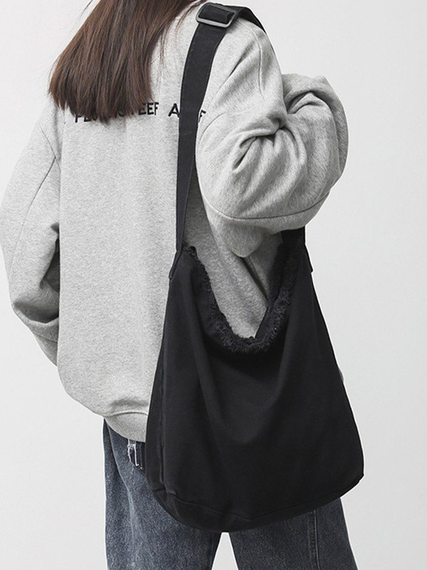 Detalles : Tiene un ribete deshilachado sin rematar, con bandolera ajustable, bolsillos interiores y diseño de cierre con cremallera metálica.