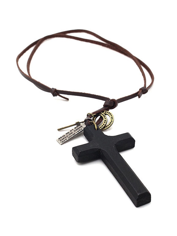 Collar de cuero con colgante de cruz de madera