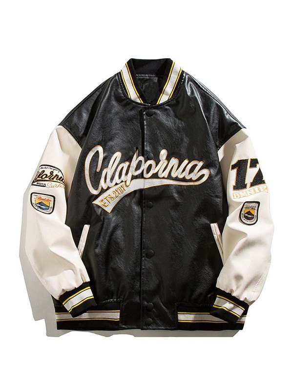 Chaqueta universitaria de cuero sintético bordado para hombre