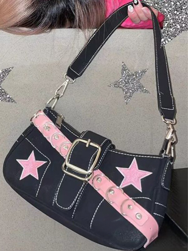 Detalles: Estos bolsos de hombro para niñas tienen una correa de hombro desmontable y metálica diseño de cadena, cuenta con un parche de estrella, paneles con cinturón con anilla en D en la parte delantera, tiene un detalle de costura en contraste y un diseño de cierre de correa con hebilla.