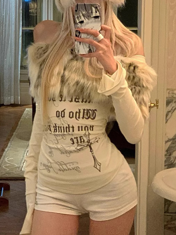 Cuello de piel de chica sexy con estampado de letras y manga larga
